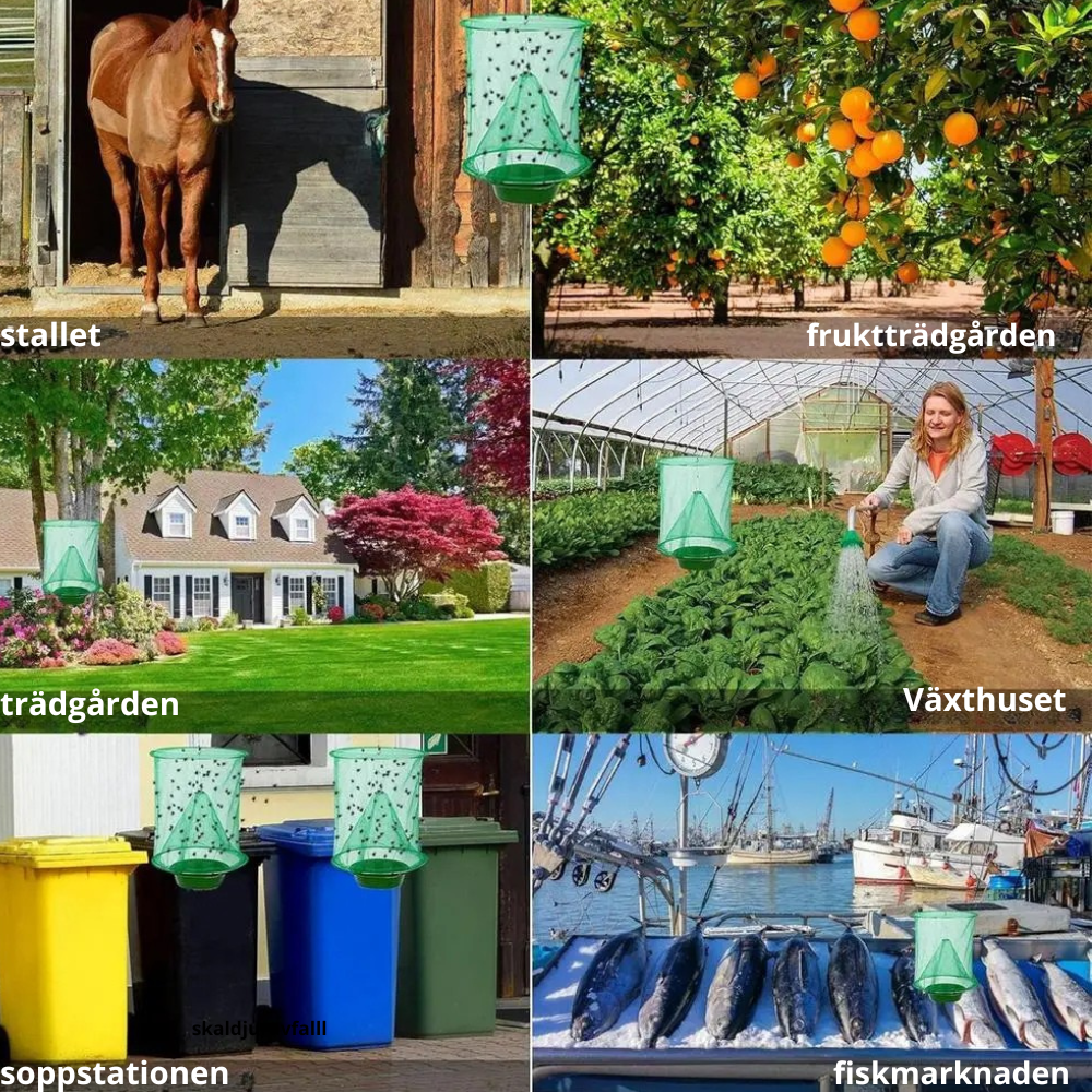 Dessa smarta, vikbara och upphängningsbara flugfällor hjälper dig bli av med flugor effektivt – i trädgården, stallet, på campingen eller uteplatsen. De är enkla att använda, lätta att rengöra och kan användas om och om igen både inomhus och utomhus.